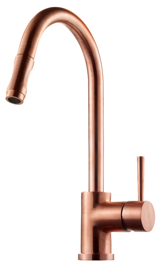Kjøkkenbatteri med høy tut, utførelse oksiderende kobber og uttrekkbar hånddusj. Ubehandlet kobber.